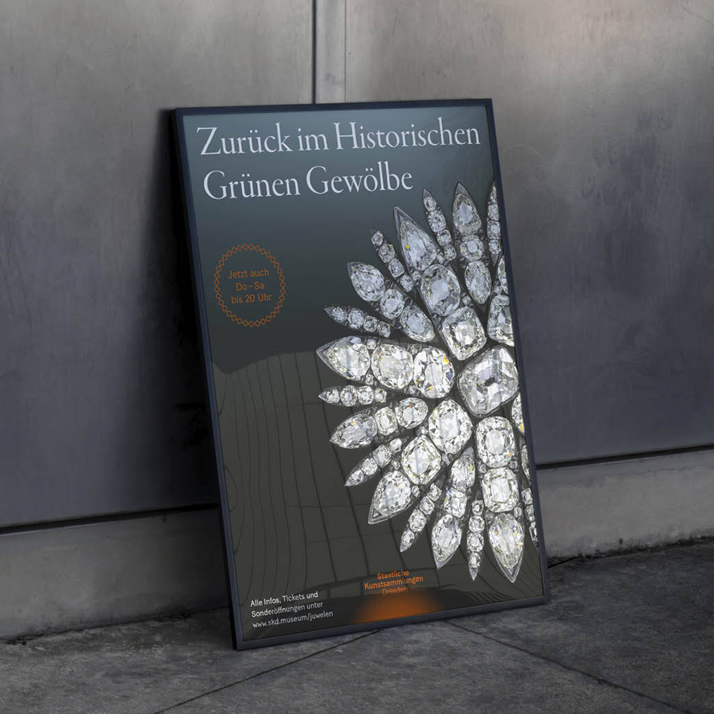 Juwelen zurück – Kampagne: Leitidee, Werbemittel, visuelle Adaption für digitale Formate, Animation für die Staatlichen Kunstsammlungen Dresden