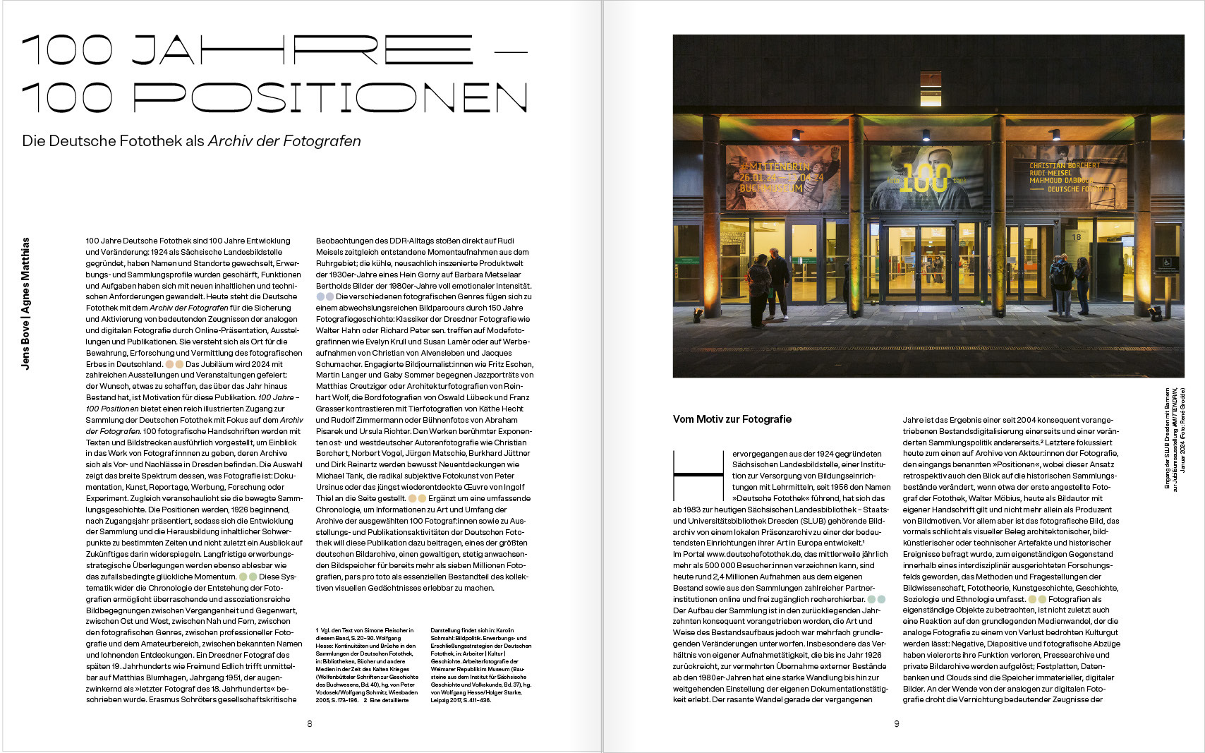 100 Jahre Deutsche Fotothek sind 100 Jahre Entwicklung und Veränderung. Namen und Standorte haben gewechselt, Funktionen und Aufgaben haben sich gewandelt, Sammlungsprofile wurden geschärft. Heute ist die Deutsche Fotothek mit ihrem Profil als Archiv der Fotografen eines der bedeutendsten Bildarchive in Europa. Das Buch blickt zurück auf eine wechselvolle Geschichte und vor allem auf das, was die Institution heute ausmacht: ein zentraler Ort zu sein für die Bewahrung, Erforschung und Vermittlung des fotografischen Erbes. Anhand von 100 Positionen wird das ganze Spektrum dessen aufgeblättert, was Fotografie ist: Dokumentation, Kunst, Reportage, Werbung oder Experiment – mit vielen bekan...