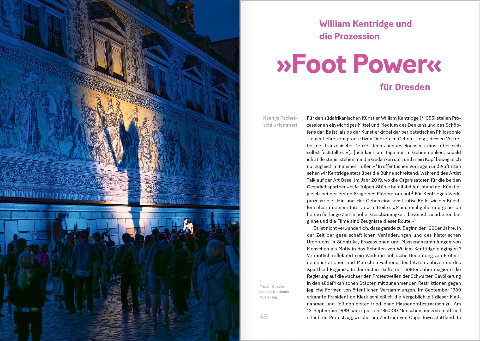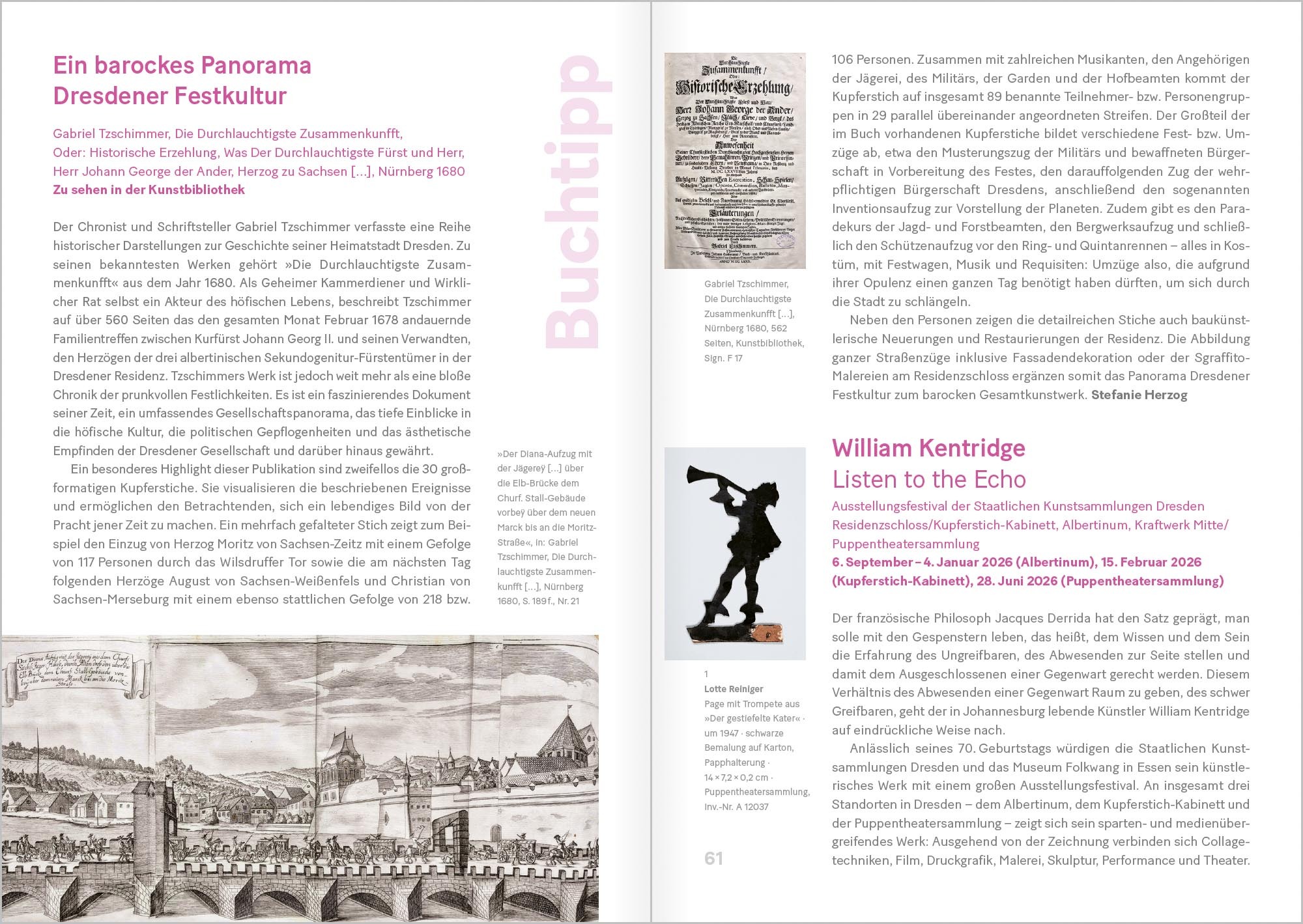 Mit dem Fürstenzug besitzt Dresden nicht nur das weltweit größte Porzellan-Wandbild – bestehend aus 23000 Meissener Fliesen –, sondern auch die einzigartige Darstellung eines 102 Meter langen Festzuges von 35 sächsischen Herrschern, um die lange Tradition des Hauses Wettin zu betonen und historisches Bewusstsein zu schaffen. Vergleichbare Aufzüge zählen bis heute zu beliebten Attraktionen von Jubiläumsfeierlichkeiten und Stadtfesten. So geht diese Ausgabe der Dresdner Kunstblätter auch anderen Beispielen nach, die sich mit der Festkultur in unterschiedlichen Kontexten beschäftigen. Besonders ein aktuelles, zeitgenössisches Projekt des südafrikanischen Künstlers William Kentridge reiht sic...