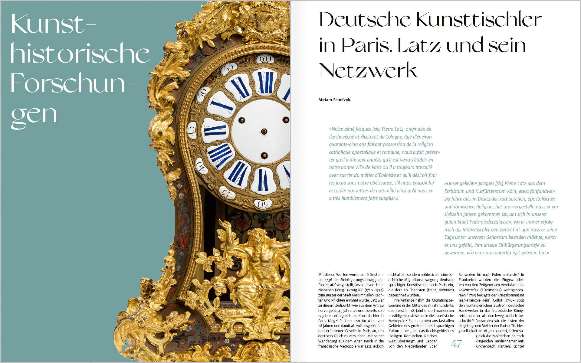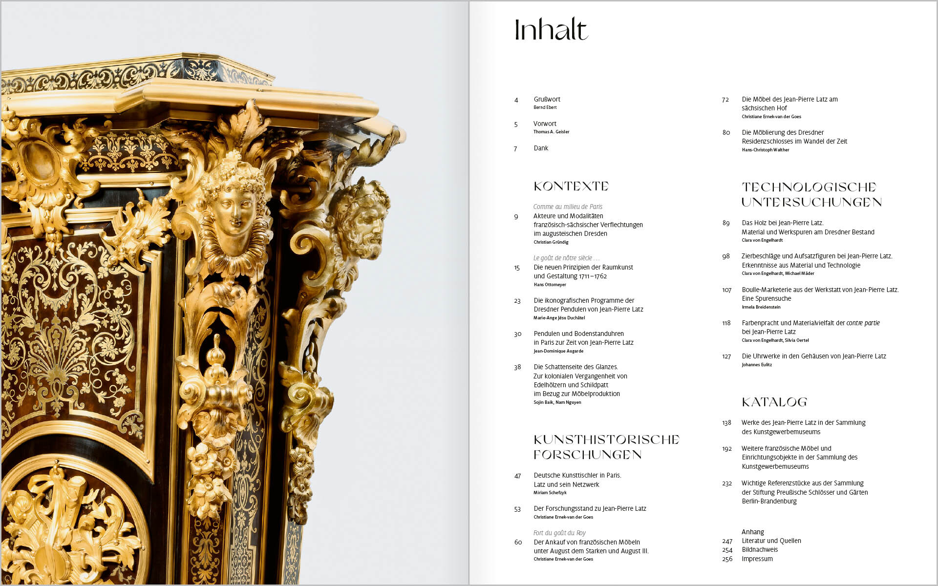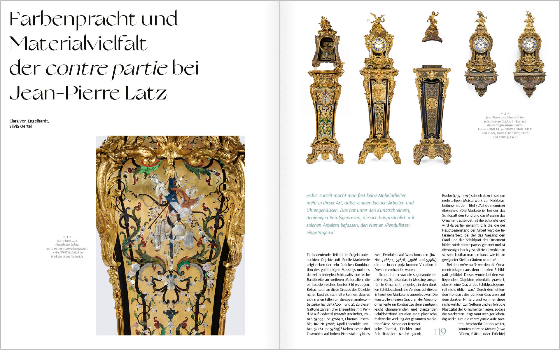 Ein außergewöhnlicher Fund im Inneren von prachtvollen Uhren, die heute zum Bestand des Kunstgewerbemuseums der Staatlichen Kunstsammlungen Dresden gehören, öffnete ein spannendes Kapitel der Kunst- und Kulturgeschichte: Mit der handgeschriebenen Signatur und dem Hinweis »Fait à Paris« hatte sich der Pariser Kunsttischler Jean-Pierre Latz (1690/91–1754) in ihnen verewigt. Die Uhren gehören zu einem umfangreichen Konvolut französischer Möbel, das die große Faszination des Dresdner Hofes für Pariser Handwerkskunst eindrucksvoll belegt. Latz’ virtuose Marketerien und exzellent geformten und gearbeiteten Beschläge verkörpern das französische Savoir-faire dieser Epoche auf höchstem Niveau. Die...