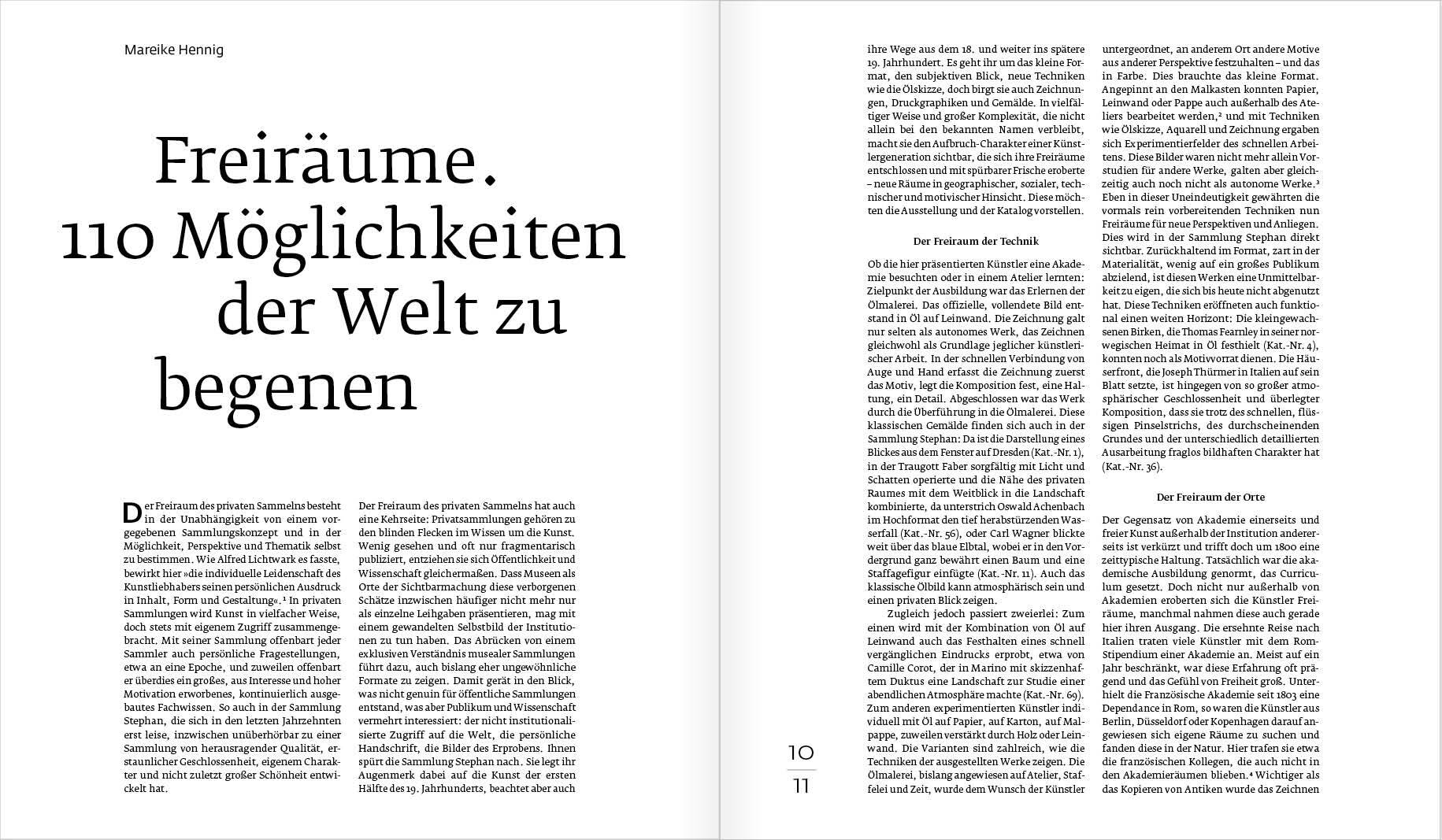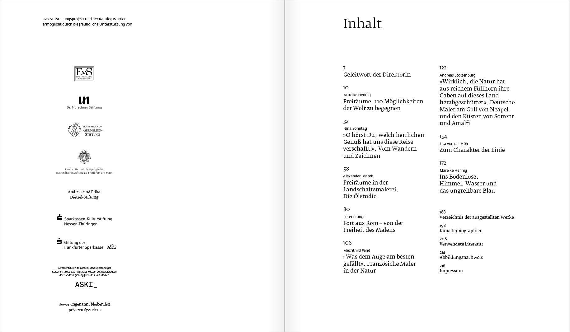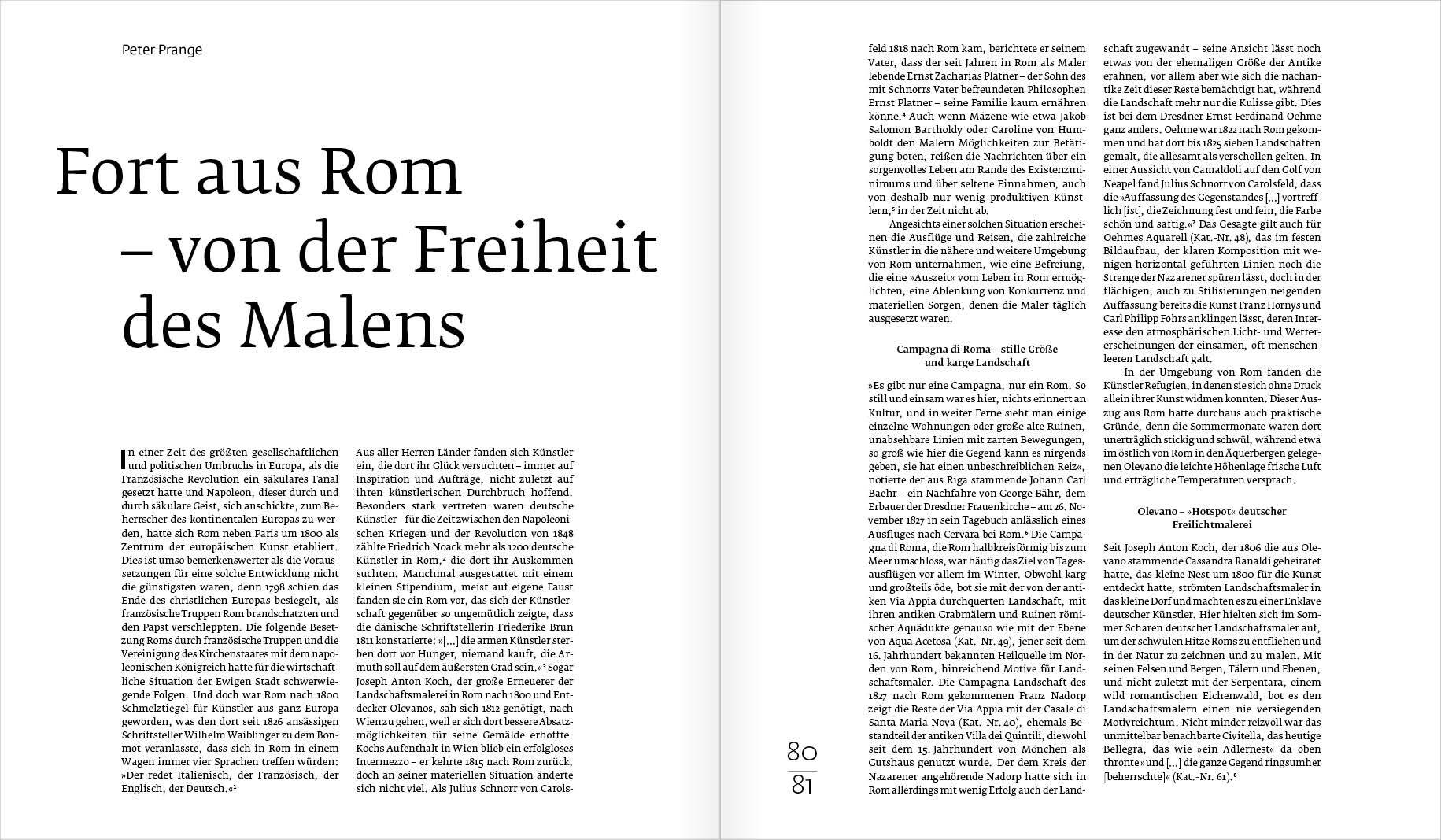 Freiräume suchte und fand die Kunst um 1800 vielfach: geographisch auf Reisen, motivisch in unidealisierten Blicken in die Welt, technisch im Erproben von Methoden wie der Ölskizze, sozial in einem gewandelten Selbstbild der Künstler. Werke dieser Art entstanden oft im privaten Umfeld und fanden erst spät ihren Weg ins Museum. Aus einer bedeutenden Privatsammlung versammelt der Katalog 110 Arbeiten von 70 Künstlern und zeigt den Aufbruch einer Generation, die sich ihre Freiräume individuell eroberte.