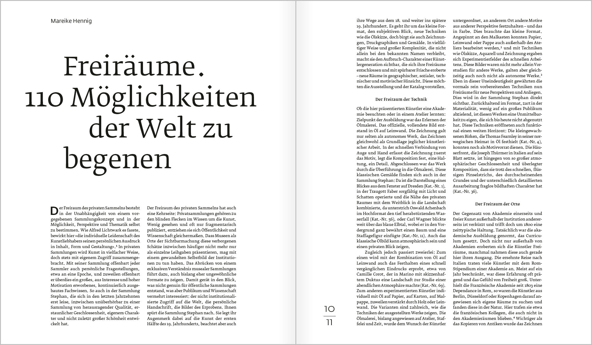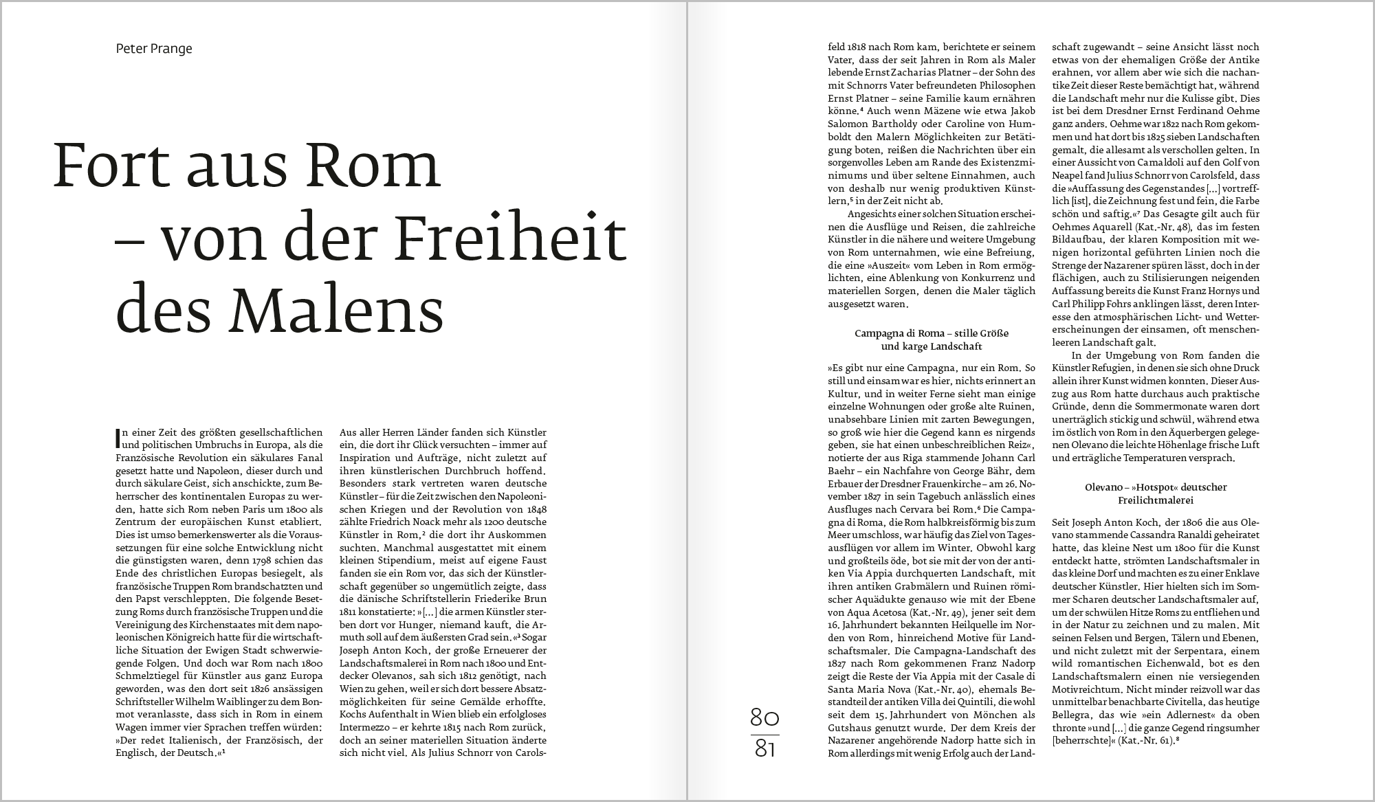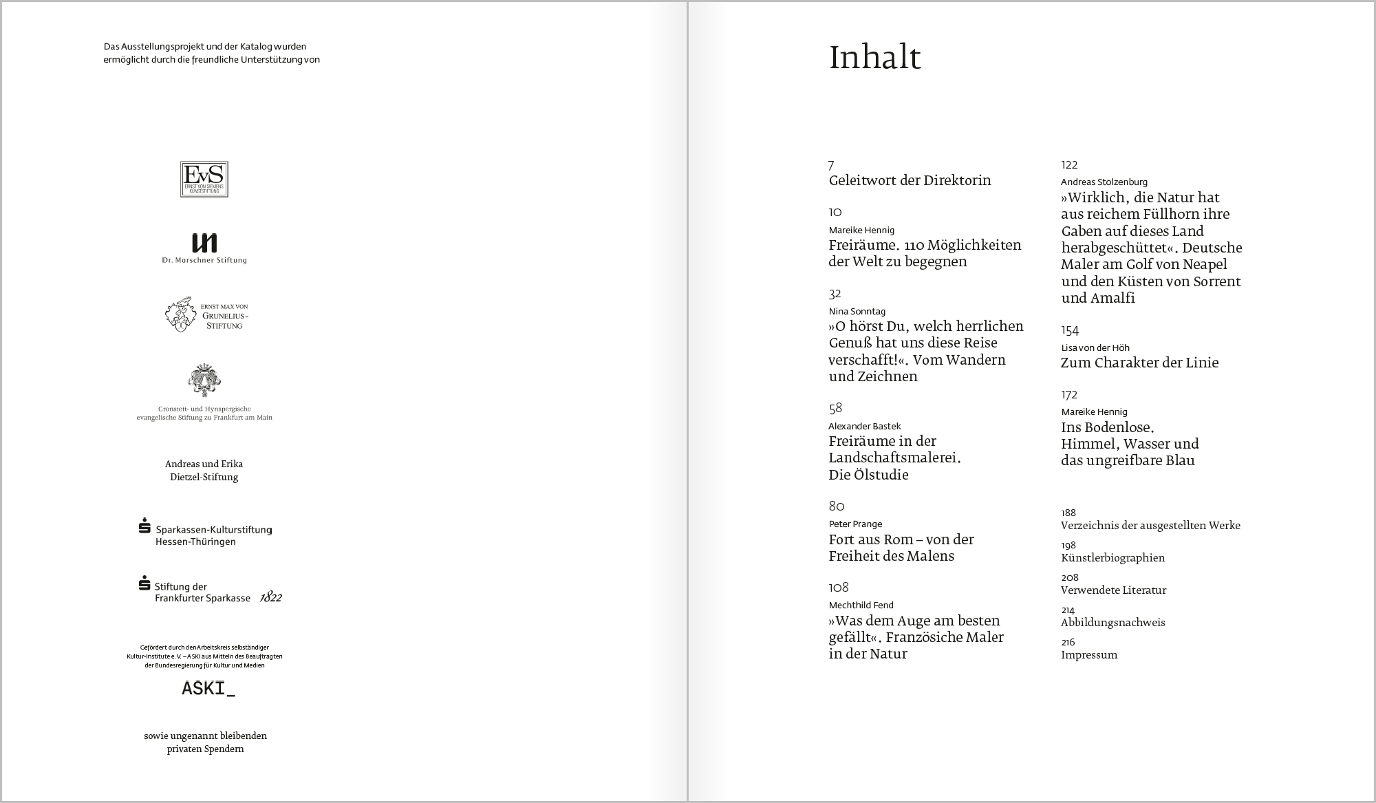 Freiräume suchte und fand die Kunst um 1800 vielfach: geographisch auf Reisen, motivisch in unidealisierten Blicken in die Welt, technisch im Erproben von Methoden wie der Ölskizze, sozial in einem gewandelten Selbstbild der Künstler. Werke dieser Art entstanden oft im privaten Umfeld und fanden erst spät ihren Weg ins Museum. Aus einer bedeutenden Privatsammlung versammelt der Katalog 110 Arbeiten von 70 Künstlern und zeigt den Aufbruch einer Generation, die sich ihre Freiräume individuell eroberte.