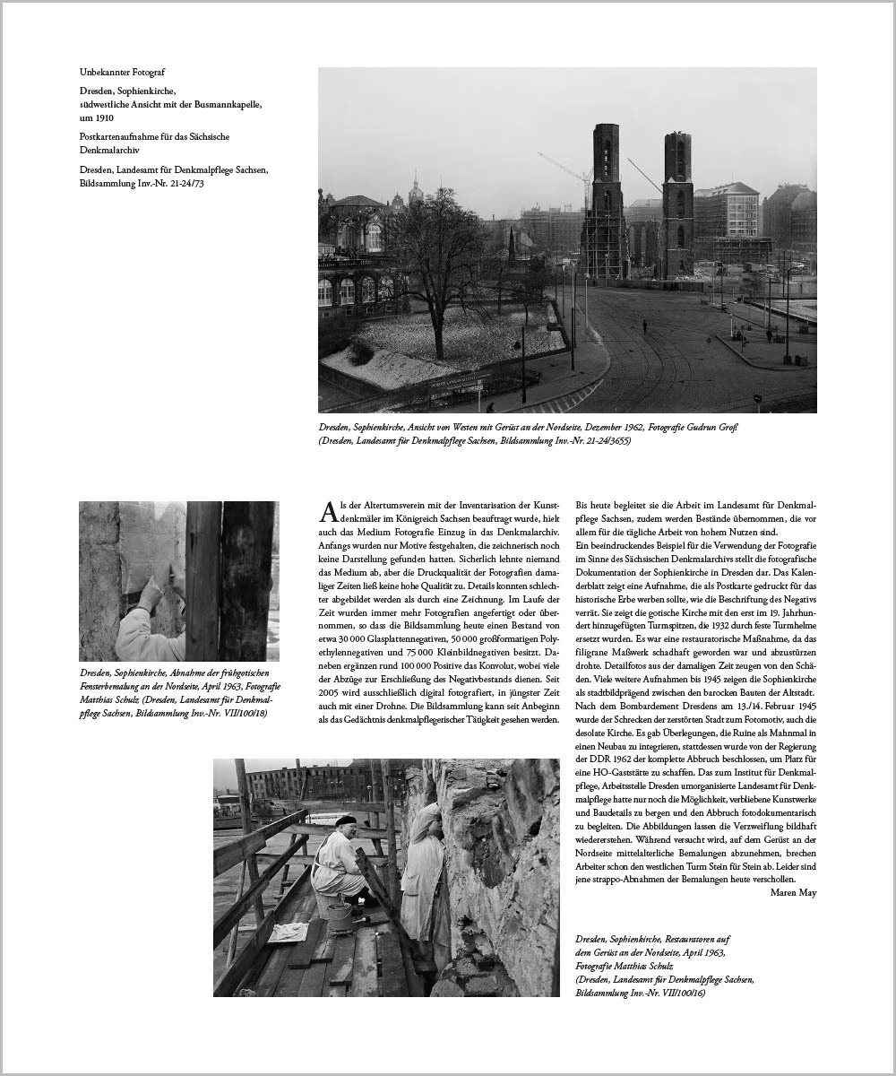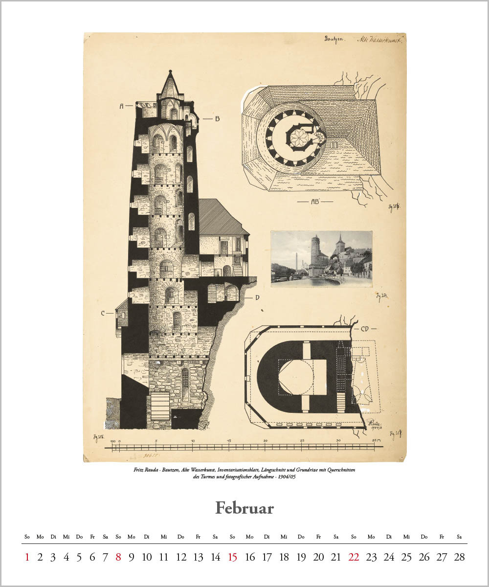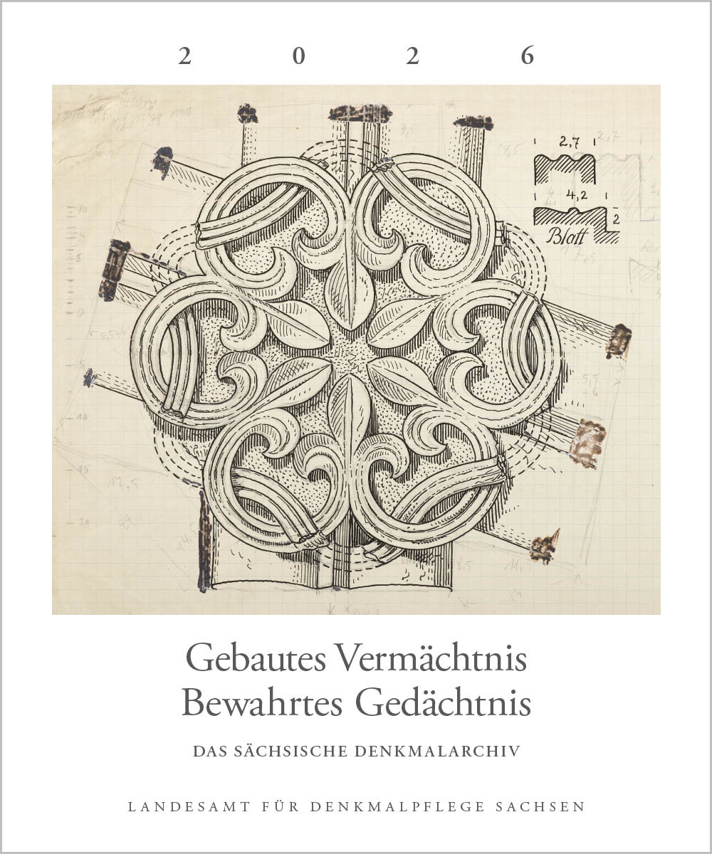 Das Landesamt für Denkmalpflege bewahrt einen reichen Sammlungsbestand, der eng mit seiner Geschichte verbunden ist und seit jeher eine unverzichtbare Grundlage für die praktische Denkmalpflege bildet. Aus diesem Fundus entsteht traditionell der »Jahresbegleiter«. 2026 werden die Sammlungen nun einmal selbst in den Mittelpunkt gerückt. Der Kalender lädt ein, die Ursprünge dieser Sammlungen zu erkunden und zu entdecken, in welcher Vielfalt das Wissen zu den sächsischen Kulturdenkmalen zusammengetragen und gespeichert wird – und zugleich dauerhafte Aufgabe der Denkmalpflege bleiben wird. Die fortdauernde Sammlungstätigkeit – verstärkt durch die Übernahme von Nachlässen von Beteiligten in der Denkmalpflege (Bau- und Kunstgeschichte, Restauration, Bildende Kunst) – erforderte eine Spezialisierung der Bestände, die zur Gliederung des Denkmalarchivs in Plansammlung, Bildsammlung (mit Abzügen und Negativen), topografische Registratur mit den Objektakten, Bibliothek, Dokumentations- und Diasammlung sowie Bauteilsammlung führte.