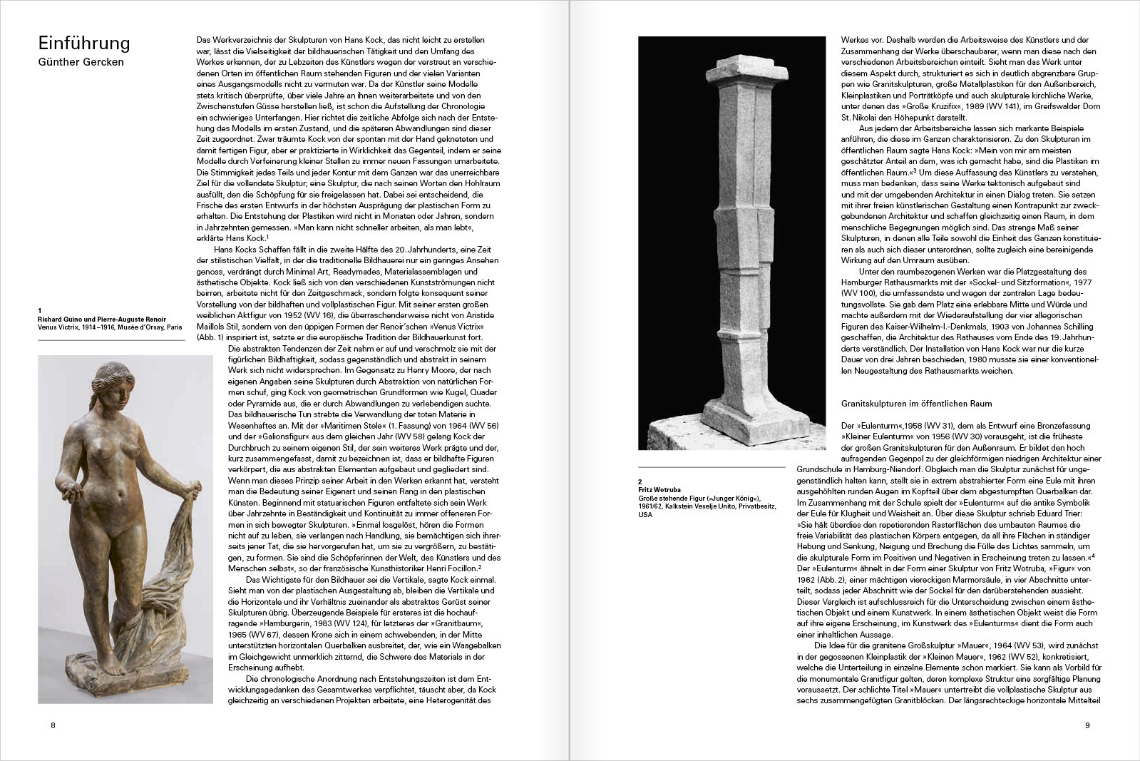 Werke des Bildhauers Hans Kock (1920–2007) finden sich nicht nur in privaten und öffentlichen Sammlungen Deutschlands, vor allem prägen sie den öffentlichen Raum in norddeutschen Städten wie Hamburg und Kiel. Aufgestellt an zentralen Orten, gestalten die großen Granit- oder Bronze-Skulpturen den Stadtraum aktiv mit. Einzigartig ist der Skulpturenpark der Hans-Kock-Stiftung auf dem Gut Seekamp in Kiel-Schilksee, wo eine Vielzahl an plastischen Werken im Einklang mit der Natur zu erleben ist. Wie viele andere Kunstschaffende der Nachkriegszeit in Europa und den USA, beschäftigte sich Kock intensiv mit dem Verhältnis von Gegenständlichkeit und Abstraktion. So entstanden an der Natur orientierte Aktfiguren und Porträts zur gleichen Zeit wie abstrakte Skulpturen aus stereometrischen und organischen Elementen. Letztlich ging es Kock jedoch um die Aufhebung der scheinbaren Gegensätze, mit denen die Kunst seiner Zeit rang.