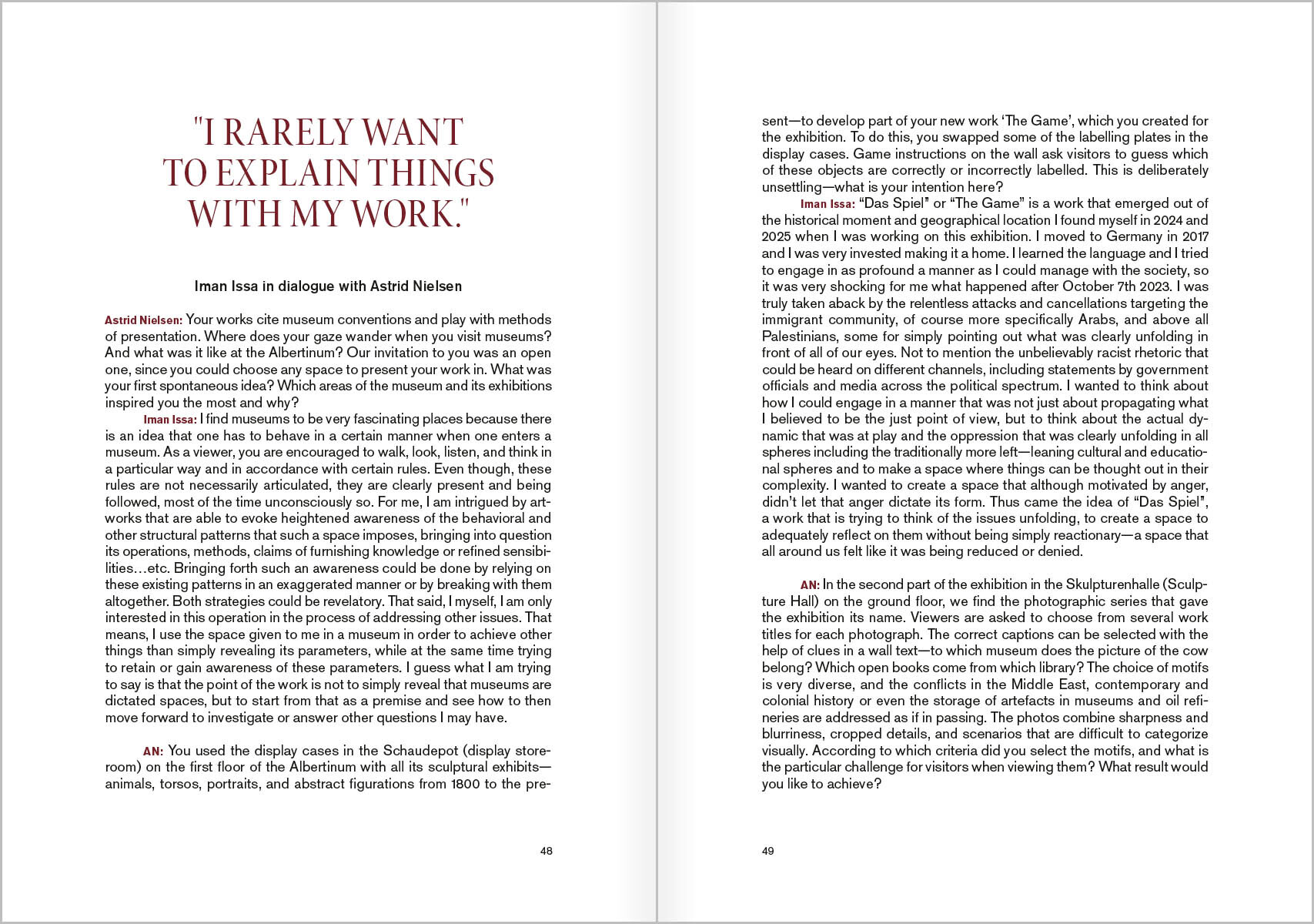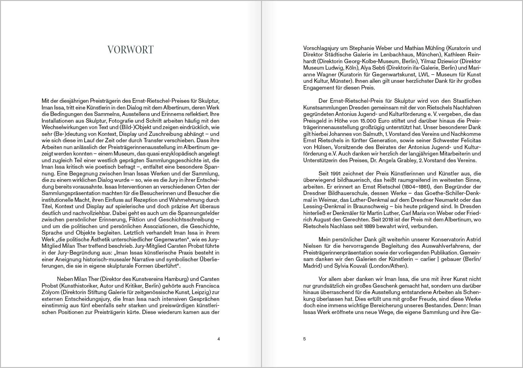 Der 13. Ernst-Rietschel-Preis für Skulptur ging an die Künstlerin Iman Issa (*1979 in Kairo), die in ihrem Werk die Geschichte von Museen und Sammlungen sowie des Erinnerns reflektiert. Ihre Installationen aus Skulptur, Fotografie und Schrift arbeiten häufig mit den Wechselwirkungen von Text und Objekt und zeigen eindrücklich, wie sehr (Be-)deutung von Kontext, Display und Zuschreibung abhängt – und wie sich diese im Lauf der Zeit oder durch Transfer verschieben. Iman Issa befragt kritisch wie poetisch die westlich geprägte Sammlungsgeschichte – so wie auch anlässlich der Preisträgerinnenausstellung 2025 im Albertinum. Es entstand ein Dialog zwischen den Werken Issas und der Sammlung des ...