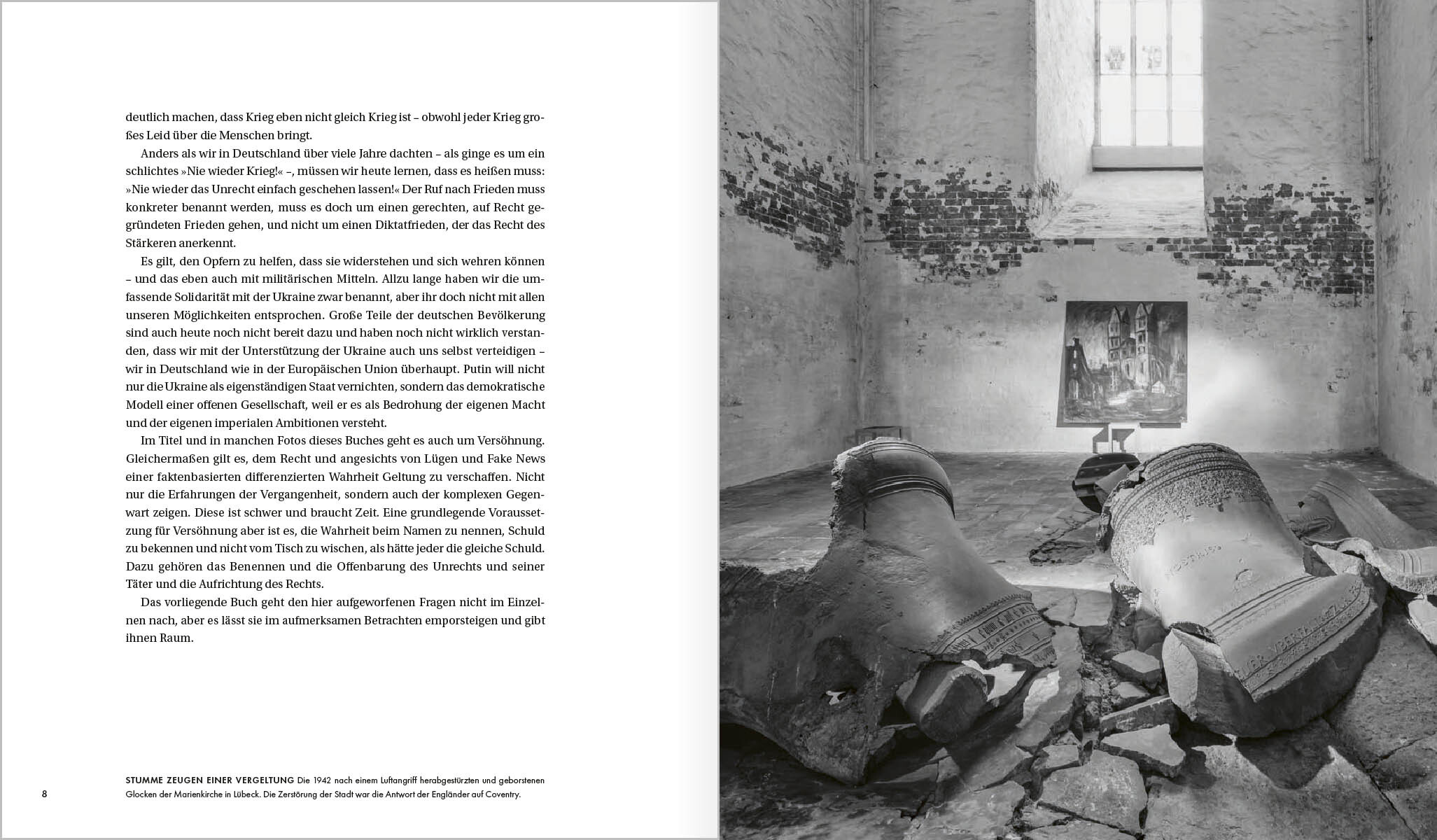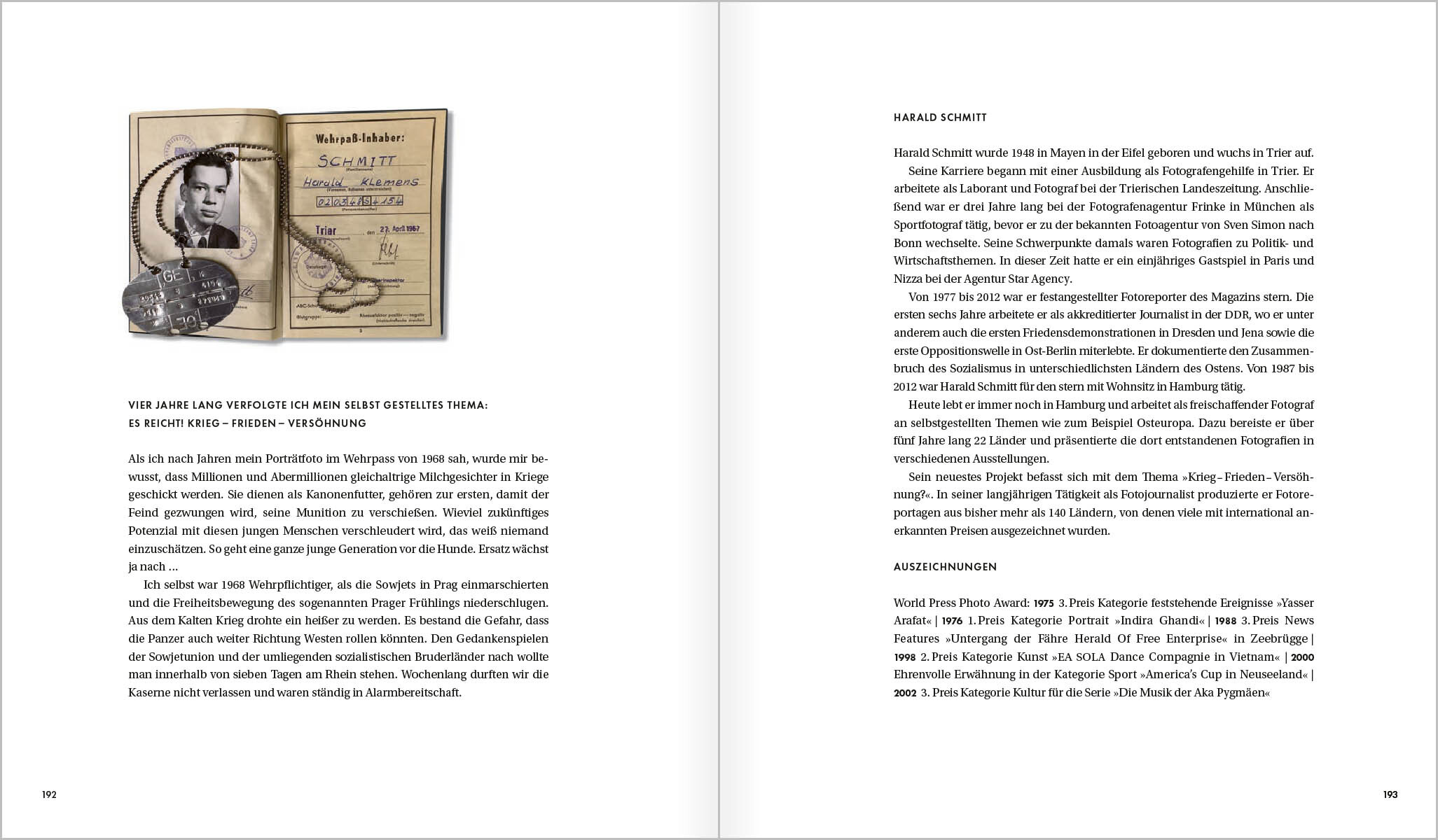 Vier Jahre lang reiste der Fotograf Harald Schmitt (geb. 1948) für dieses Buch durch Europa und besuchte historische Orte, an denen das Grauen ebenso spürbar war wie die Mahnung. Das Grabfeld von Gefallenen ist ein stummes Zeugnis dessen, was geschieht, wenn Diplomatie und Vernunft versagen. Zahlreiche Soldaten liegen namenlos in Massengräbern, andere werden bis heute vermisst. Zu viele Menschen wurden erschossen, verbrannt, erstochen, zerstückelt, an die Wand gestellt, sind im Gas umgekommen, im Irrenhaus gelandet oder wurden als Düngemittel zu Knochenmehl verarbeitet. Sie kehrten traumatisiert zurück, unfähig, das Erlebte je in Worte zu fassen. Wir alle wissen, dass das Ausmaß des Ungeheuerlichen kaum zu begreifen ist, solange wir nicht selbst davon betroffen sind.