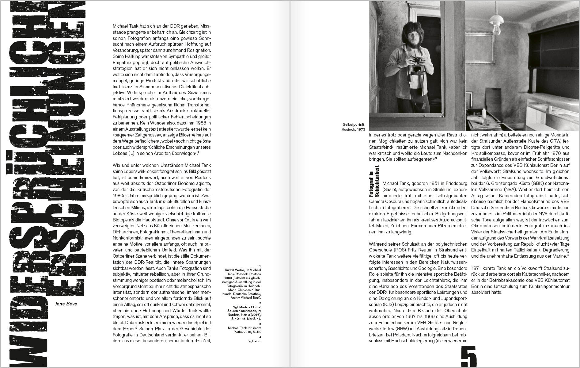 Michael Tank hat sich an der DDR gerieben, Missstände prangerte er beharrlich an. Gleichzeitig ist in seinen Fotografien eine gewisse Sehnsucht nach einem Aufbruch spürbar, Hoffnung auf Veränderung, später dann zunehmend Resignation. Wie und unter welchen Umständen Tank das Leben in der DDR bis zu seiner Flucht fotografisch ins Bild gesetzt hat, ist bemerkenswert, auch weil er von Rostock aus weit abseits der Ostberliner Bohème agierte, von der die kritische ostdeutsche Fotografie der 1980er-Jahre maßgeblich geprägt worden ist. Seine Motive fand Tank im privaten und betrieblichen Umfeld, mitten im Alltag, aber auch an den Rändern der Gesellschaft. Die erste umfangreiche Auswahl aus dem Werk von Michael Tank lädt ein zur Wiederentdeckung eines Fotografen, dessen Bilder durch einen authentischen, immer empathischen und vor allem fordernden Blick geprägt sind. Michael Tank wollte zeigen, was ist, mit dem Anspruch, dass es nicht so bleibt.